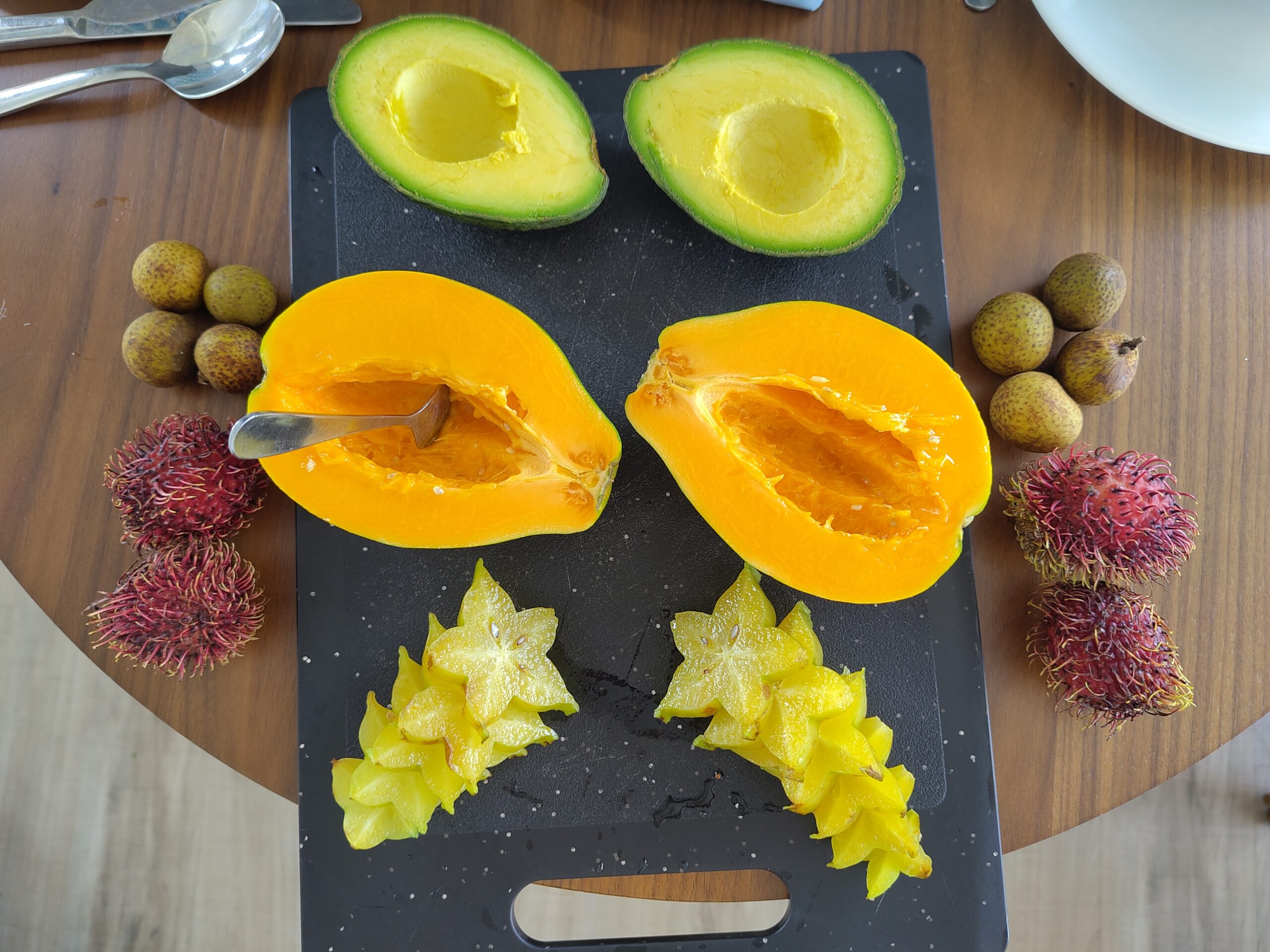 Heute gab’s mal Bananen-Pancakes mit Erdnussmus und Papaya.